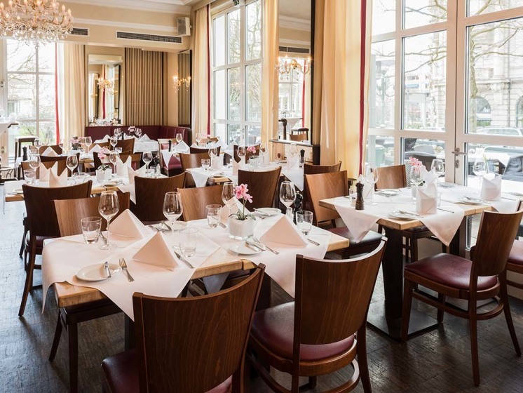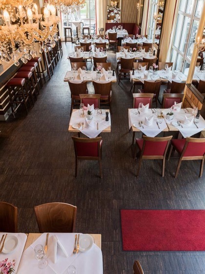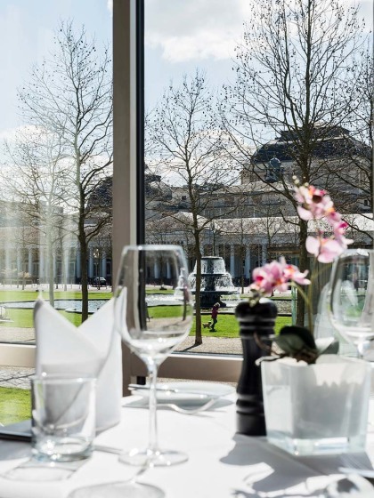 Vor dem Kurhaus genießt man als Gast hier auf der Terrasse die schönste Aussicht. Direkt gegenüber liegt das Hotel Nassauer. Beim Betreten des Restaurants fallen die schweren Kronleuchter ins Auge. Die Tische sind mit weißer Tischdecke, Besteck und Gläsern eingedeckt. Eine große Auswahl vornehmlich deutsche Gerichte mit internationalem Einfluss bietet die Speisekarte: Carpaccio vom Taunus-Rind, IslandKabeljau in Kartoffelkruste oder Blutwurst mit karamellisiertem Apfel-Chicorée. Aber auch Handfestes wie hausgemachte Linsensuppe lässt sich hier finden. Das Casino liegt direkt neben dem Restaurant, weshalb es sich anbietet, hier stilvoll vor oder nach dem Besuch des Roulett-Tisches ein Glas Champagner an der Bar zu trinken – je nachdem, wie viel Glück man im Spiel hat. Apropos Champagner: Inhaber Oliver Henrich lässt in seinem In-Restaurant mit Lounge und langer Bar auch regelmäßig Partys steigen, die von Gästen als legendär bezeichnet werden.