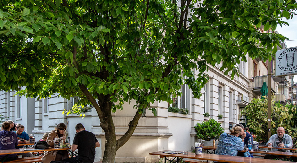 Dem traditionellen Apfelwein – in Hessen „Ebbelwoi“– ein neues, hippes Image zu verleihen, ist Martin Hönes mit seiner Kneipe „Schoppenhof“ eindeutig gelungen. Ganz gleich ob lieber süß oder sauer gespritzt, jung oder alt – gesellig sitzt man auf rustikalen Bänken, genießt lokale Spezialitäten wie „Handkäs mit Musik“ und stößt dazu mit einem goldgelben Apfelmost gefüllten Glas oder dem klassischen „Bembel“ an. Im Winter in uriger Atmosphäre mit holzvertäfeltem Kickerraum, im Sommer auch draußen auf der Terrasse mit schattigen Sitzplätzen unter Bäumen.
