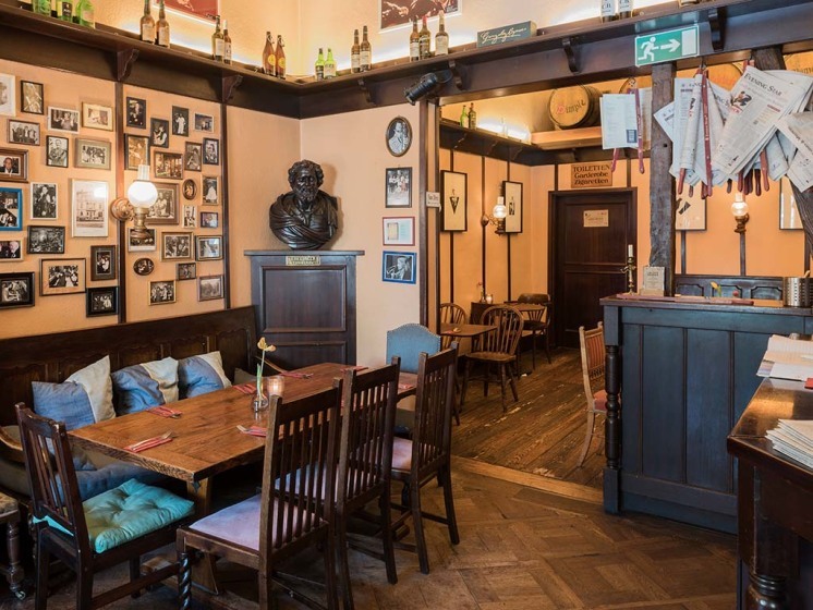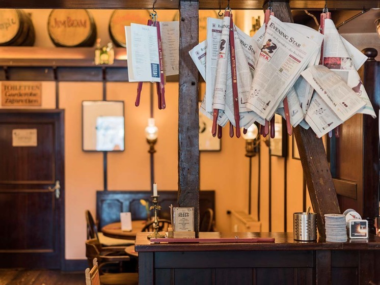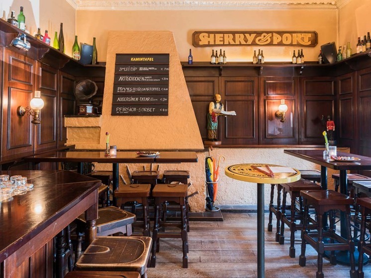 Im Stil eines englischen Pub eingerichtet, läutete früher noch eine Glocke am Tresen zur ersten und zur letzten Runde. Heute werden spanische Spezialitäten und viele Biersorten oder ausgesuchte Spirituosen sowohl im Restaurant als auch draußen serviert. Auf der Getränkekarte finden Gäste – neben Portweinen und Sherrys – natürlich auch Weine, Gin oder Whisky. Im Sommer sitzt man gemütlich im Biergarten um den Brunnen herum. Vor allem in der kälteren Jahreszeit wird an Wochenenden regelmäßig Blues, Folk oder Jazz live gespielt.